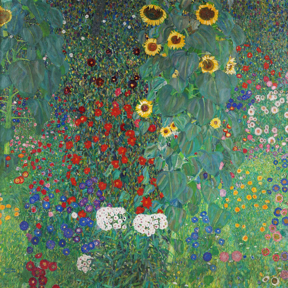 Farm Garden with Sunflowers exemplifies Klimt’s innovative approach to landscapes, where depth and perspective are replaced by intricate arrangements of color and form. His deliberate flattening of spatial dimensions creates a decorative, almost textile-like quality, prompting contemporaries such as German painter Max Liebermann to liken Viennese painting to “painted carpets.”
