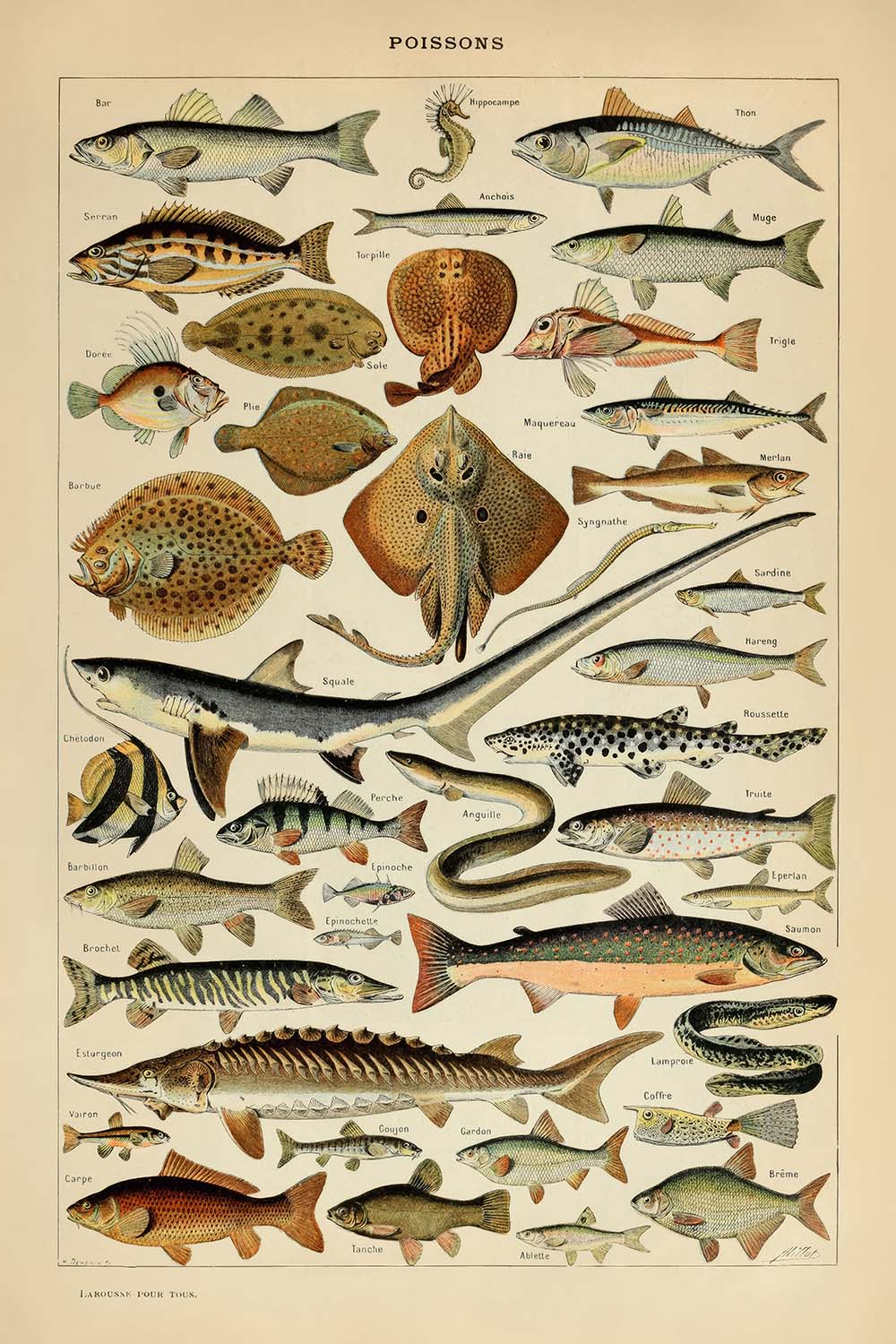Fish by Adolphe Millot is a captivating zoological illustration from the Victorian era, originally published in the celebrated French encyclopedia, "Le Larousse pour tous : nouveau dictionnaire encyclopédique" in 1890. This exquisite artwork showcases Millot’s meticulous attention to scientific detail and artistic sensitivity, presenting an array of fish species, each beautifully rendered and labelled in French. Adolphe Philippe Millot, a renowned French painter, lithographer, and entomologist, is known for his natural history illustrations that combine scientific accuracy with an unmistakable elegance. As the senior illustrator at the Muséum national d'histoire naturelle and a distinguished member of both the Salon des Artistes Francaise and the Société entomologique de France, Millot’s legacy endures in his enchanting visual catalogues of the natural world.