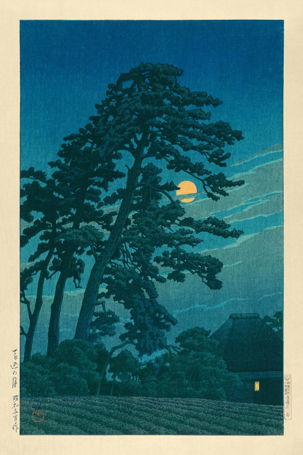 Notably, Full Moon at Nagome stands out for its sophisticated interplay of rich blues and subtle greys, conjuring a sense of peace and mystery at dusk. The meticulous detail in the intricate foliage and delicate architecture highlights Kawase's exceptional artistry, offering an emotive journey to a serene moment in time.