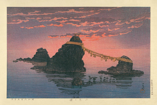 The captivating artwork "Futamigaura Sea and Rocks" by Hasui Kawase, created in 1935, epitomizes the enchanting allure of Japanese landscapes through the medium of woodblock printing. Hasui Kawase, a distinguished figure in the Shin-Hanga movement, brought together traditional ukiyo-e techniques with Western-inspired elements to revitalize Japanese art. His work is celebrated for capturing serene and atmospheric moments imbued with emotional depth.