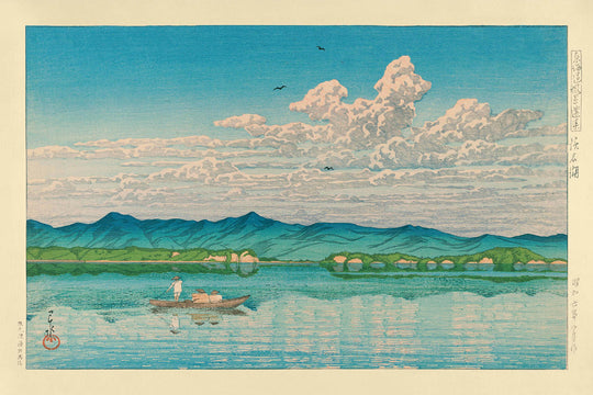 The artwork "Lake Hamana" is celebrated for its harmonious composition and the captivating use of color, especially the soft interaction between the blue waters of the lake and the lush surrounding greenery. The print features Kawase's signature style, emphasising a lyrical balance and seamless flow in depiction of water, sky, and land. These beautiful natural elements embody serenity, offering an art piece that not only elevates space but invites meditative calm.