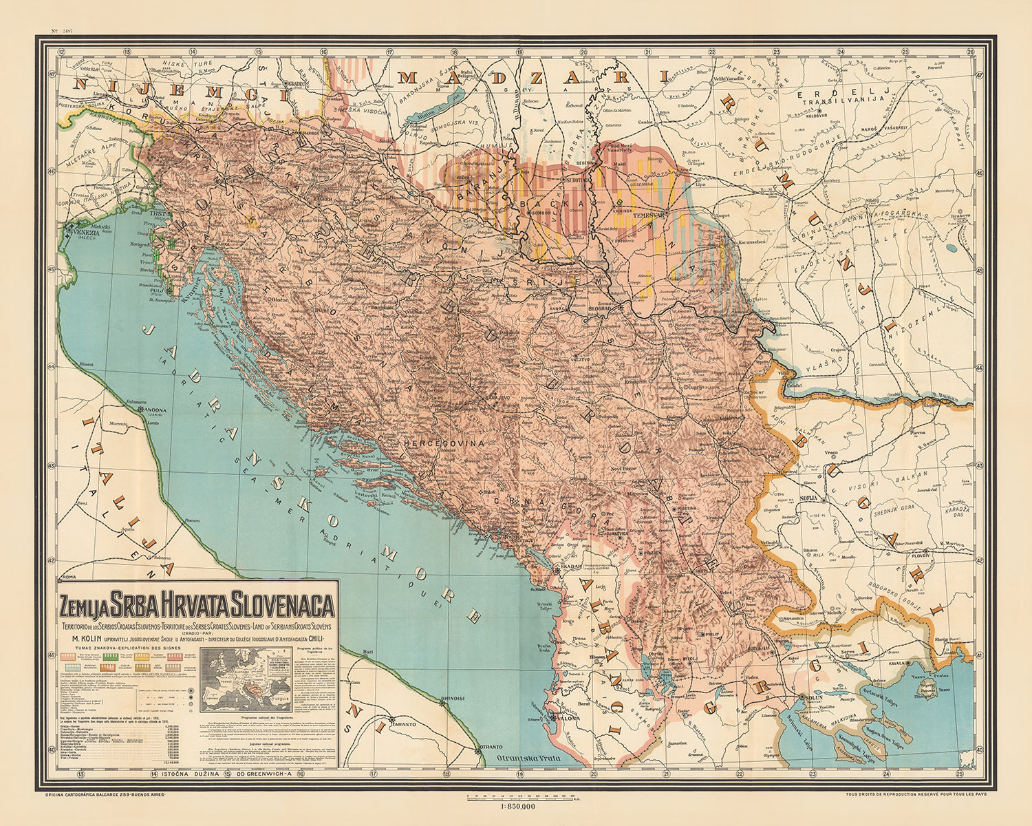 Introducing the "Zemlja Srba, Hrvata, Slovenaca," a captivating cartographic masterpiece crafted by Marcel Kolin in 1917. This extraordinary map is not merely a depiction of geographical boundaries but a vivid representation of the aspirations and dreams of a united Yugoslavia during the tumultuous times of World War I. Published in Buenos Aires, this map was a beacon of hope for Yugoslav emigrants in South America, rallying support for the creation of an independent nation encompassing the territories of Serbians, Croats, and Slovenes.