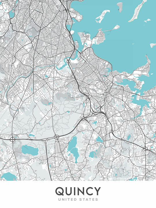 This map of Quincy, Massachusetts is a modern, detailed street map that focuses on the city's unique character and charm. The map is centered on the city center, and extends approximately 9 miles to the north of the center point, and 9 miles to the south of the center point. The map extends roughly 7.5 miles to the west of the centre point, and 7.5 miles to the east of the centre point.
