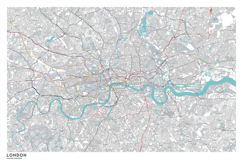 Modern London Map with Real Underground Tube & Overground Train Routes