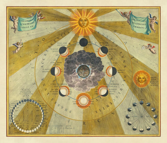 An exceptionally superb celestial chart showing the phases of the Moon, originally published in 1661 in Andreas Cellarius' "Harmonia Macrocosmica seu Atlas Universalis et Novus", which is often considered the greatest celestial atlas ever created.