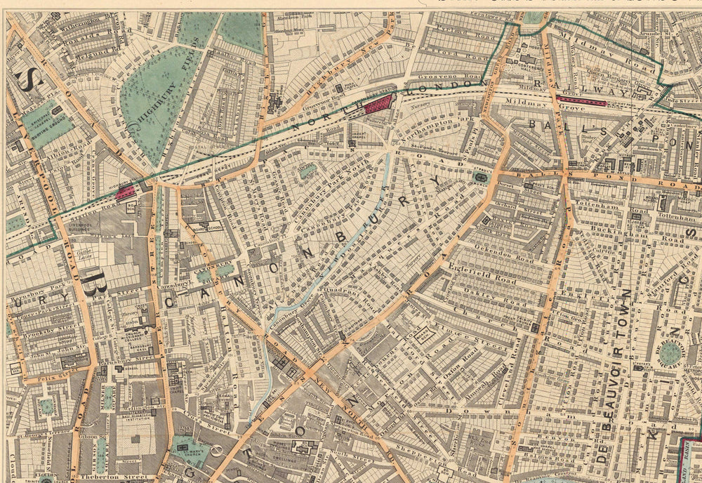 On this map you can clearly see: Hoxton, Haggerston, Clerkenwell, Bethnal Green, London Fields, Dalston, Kingsland, Canonbury, Shoreditch and De Beauvoir Square.