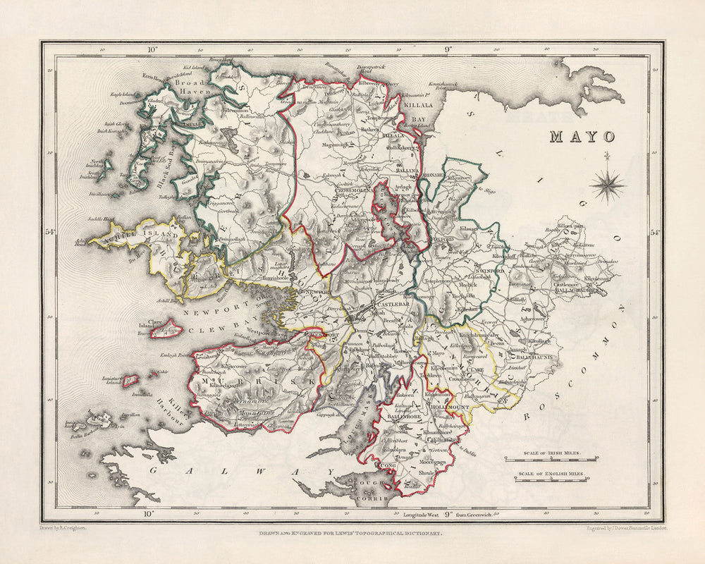 Old Map of County Mayo by Samuel Lewis, 1844: Westport, Ballina, Castlebar, Achill Island, Clew Bay
