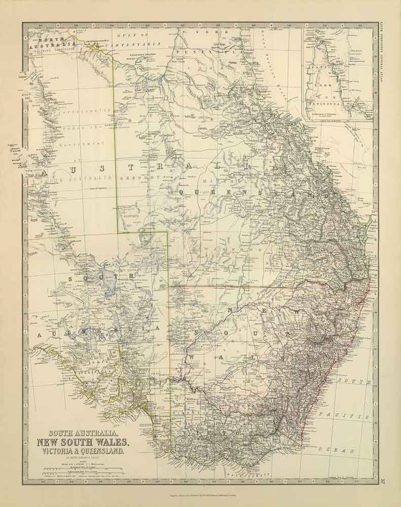 A lovely and rare early map of eastern Australia, originally published in 1879 by AK Johnston out of Edinburgh. This map shows the states of Queensland, New South Wales, South Australia and Victoria - and also a tiny bit of North Australia, which would later become part of the Northern Territory.