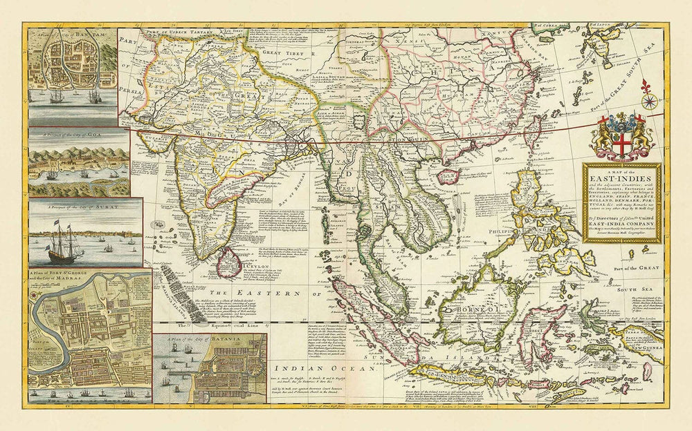 Old Map of India & Southeast Asia, 1717 by Herman Moll: Colonial East Indies, China, Malaysia, Thailand, Singapore, Indonesia