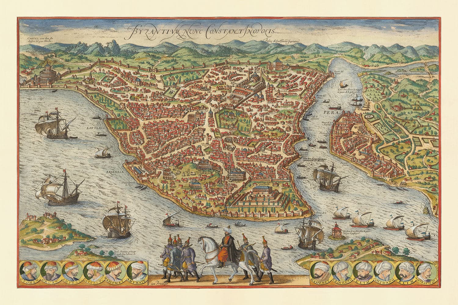 Old Map of Istanbul, Constantinople in 1572 by Georg Braun: Byzantium, Bosporus, Golden Horn, Topkapi Palace