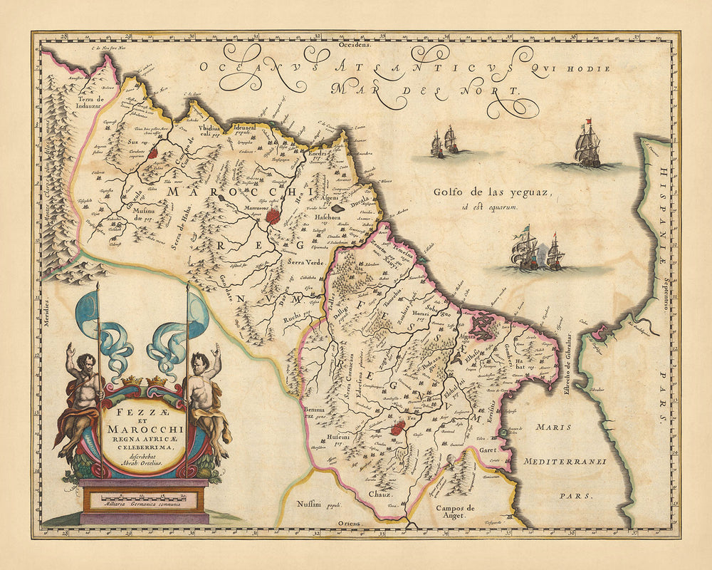 Immerse yourself in the rich tapestry of history with the exquisite 'Fezzae et Marocchi regna Africae celeberrima, describebat Abrah' map, a masterful creation by the renowned mapmaker Nicolaes Visscher II. Translated into English, the title signifies 'The most celebrated kingdoms of Fez and Marrakech in Africa, described by Abraham'. This map, dating back to 1690, offers a detailed view of the regions of Fez and Marrakech, along with the larger area of Morocco, a land steeped in culture and history.
