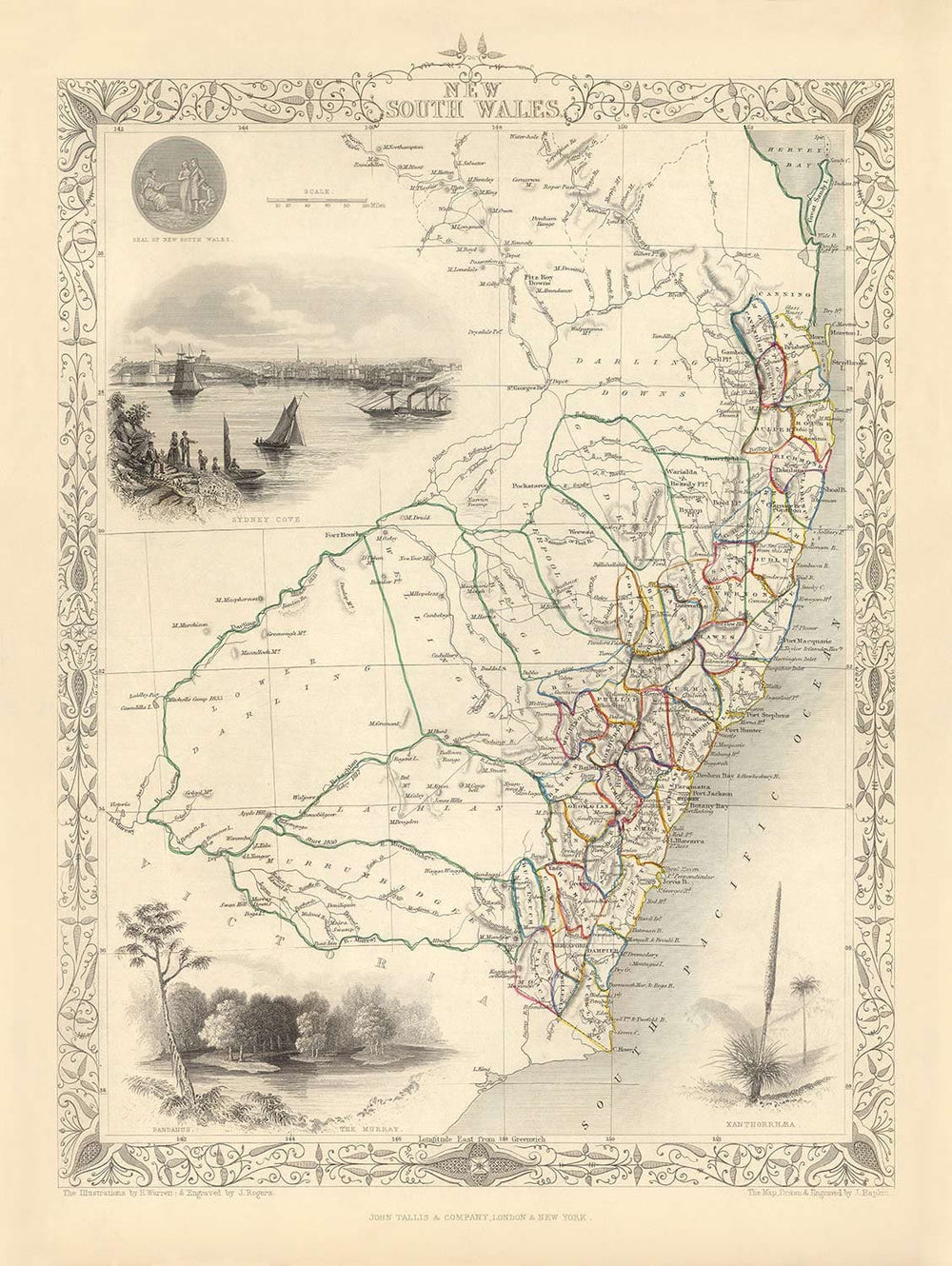 Old Map of New South Wales, Australia 1851 by Tallis & Rapkin: Sydney, Newcastle, Brisbane, Botany Bay, NSW Counties