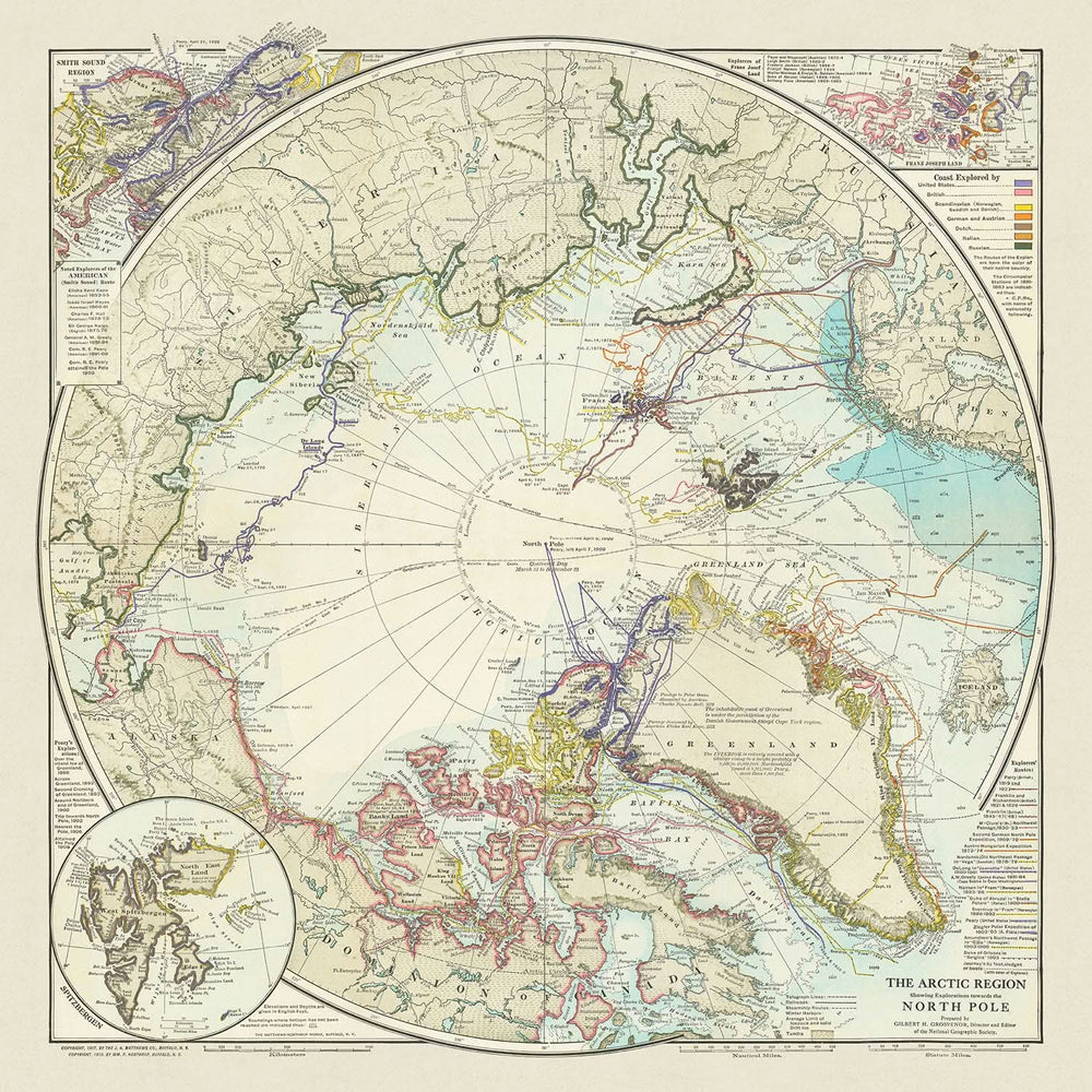 Historically significant, this map marks a pivotal moment in Arctic exploration. It captures the essence of Robert Peary's legendary journey, which was celebrated as the first successful expedition to the North Pole. This map was crafted at a time when the National Geographic Society was at the forefront of promoting geographical knowledge, serving as an educational tool for the American public. It stands as a tribute to the explorers who risked their lives to expand the boundaries of human knowledge.