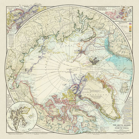 The map is not just a representation of geographical features but a testament to human perseverance and curiosity. It elegantly portrays the Arctic region, including Greenland, Canada, and parts of Russia, as well as the vast Arctic and North Atlantic Oceans. The inclusion of inset maps of Smith Sound, Franz Josef Land, and Spitzbergen adds depth and context, offering a comprehensive view of the challenges faced by explorers in these treacherous terrains. Each route and landmark is meticulously detailed, reflecting the painstaking efforts of those who ventured into the unknown.