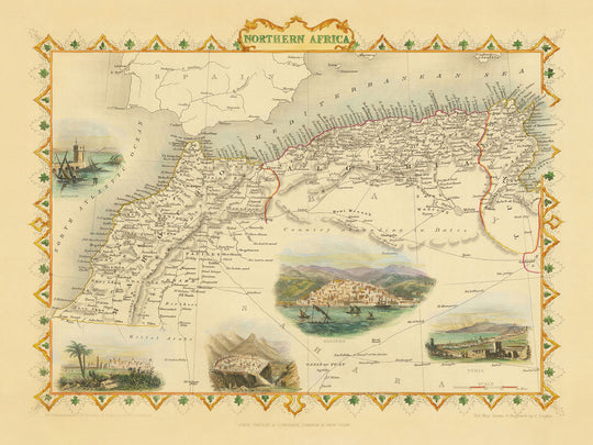 Old Map of Northern Africa by Tallis & Rapkin, 1851: Tunis, Algiers, Constantine, Atlas Mountains, Sahara