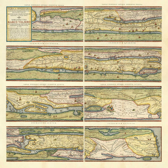 Ortelius created this map at the end of the 16th century from the Peutinger Table, a 13th century manuscript that itself is a copy of an even older manuscript map of the Roman Empire's road network, known then as the "cursus publicus"