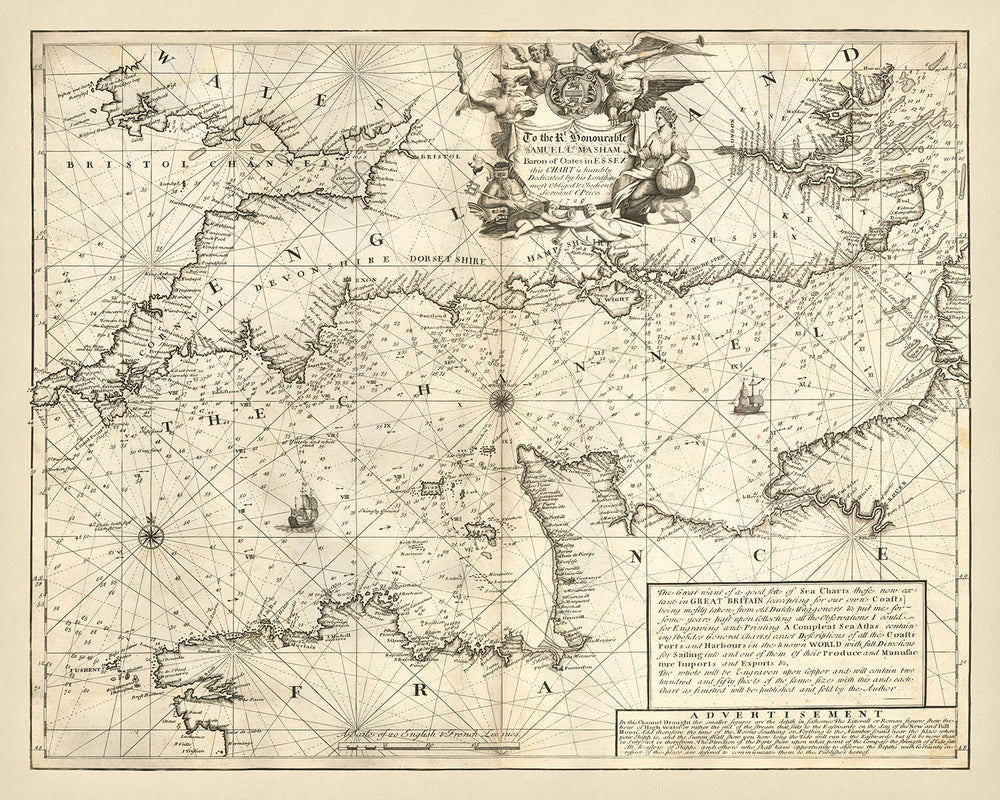 Beyond its practical maritime utility, the chart is adorned with artistic elements that elevate it from a mere sea chart to a work of art. The dedication to Samuel Masham, 1st Baron Masham, is flanked by two cherubs, embodying the elegance and reverence of the era. A compass rose and rhumb lines guide the mariner's path, while decorative flourishes and illustrations of notable features like the Eddystone Lighthouse, the Goodwin Sands, and the Isle of Wight add a layer of aesthetic pleasure and historical context to the chart, making it a prized possession for collectors and enthusiasts alike.
