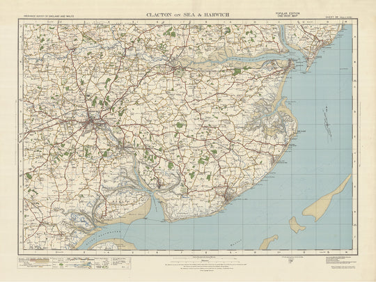 The "Sheet 98 - Clacton on Sea & Harwich" map from Ordnance Survey's One-inch "Popular" edition, England and Wales, published in 1925, is a fascinating historical document that provides a glimpse into the past. This meticulously detailed map showcases the towns of Clacton on Sea and Harwich, along with other significant locations such as Colchester, Walton-on-the-Naze, Felixstowe, and the Dedham Vale Area of Outstanding Natural Beauty (AONB).