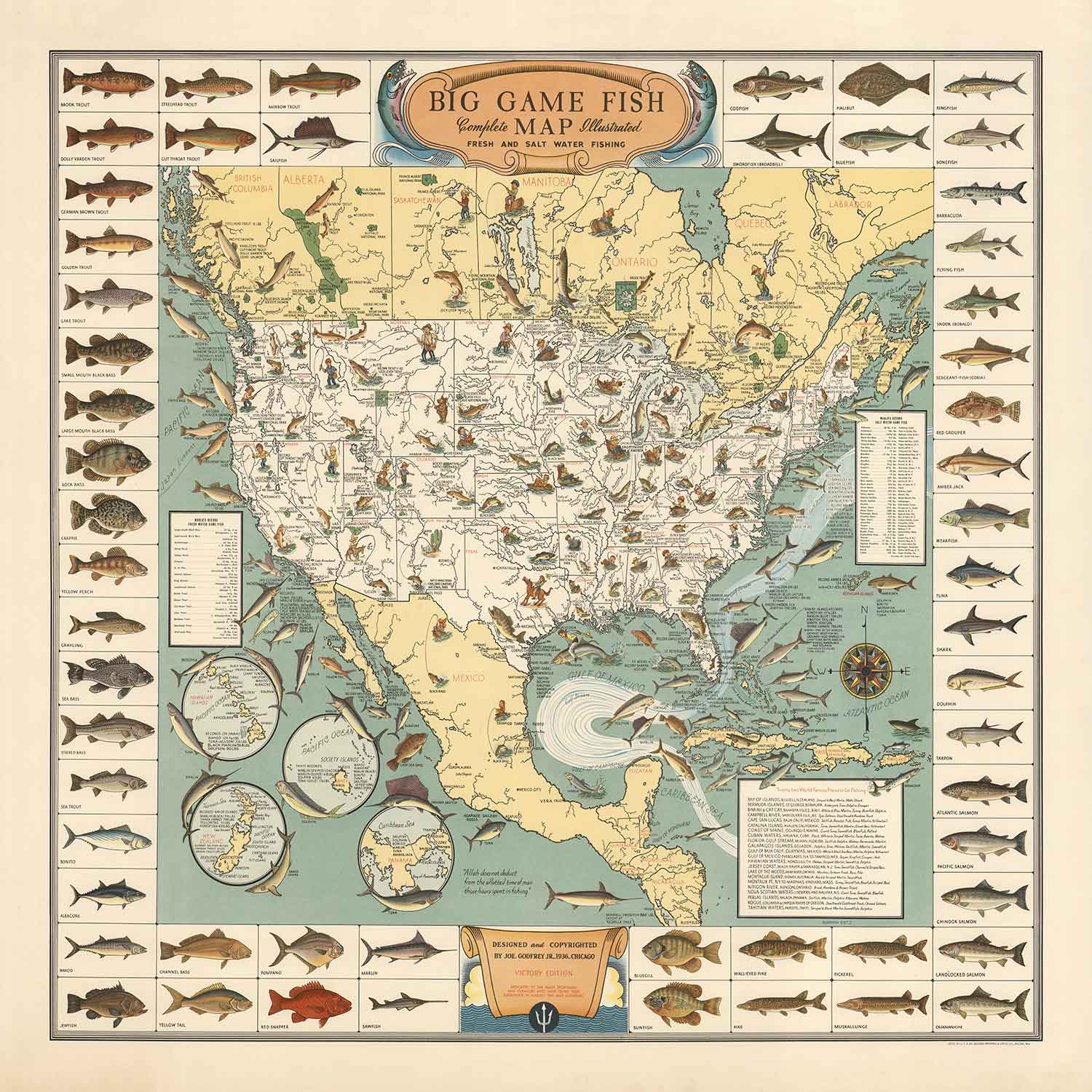 Old Pictorial Big Game Fish Map of the USA, 1936: Alaska, Florida, Michigan, Minnesota, Louisiana