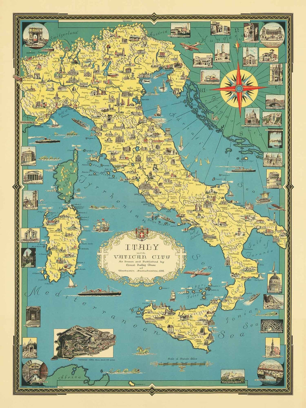 Old Pictorial Map of Italy, 1935 by E. Chase: Illustrated Landmarks, Vatican, Venice, Florence, Rome, Sardinia