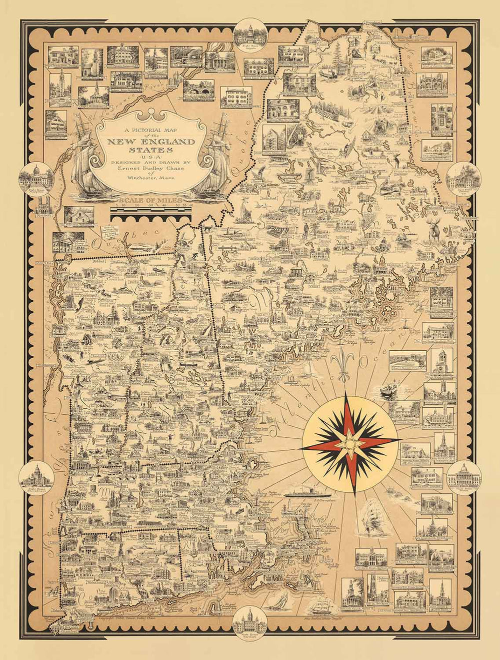 This masterfully illustrated map by Earnest Dudley Chase shows a very detailed pictorial map of New England in 1939. You won't really find a more detailed or interesting map of New England.