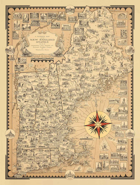 Old Pictorial Map of New England, USA, 1939 by Ernest Dudley Chase: Maine, Vermont, New Hampshire, Massachusetts, Connecticut, Rhode Island