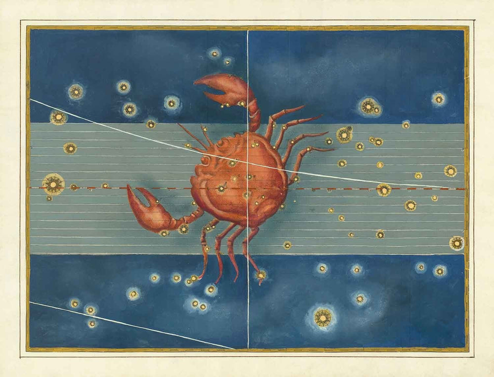 A stunning and exceptionally rare handcoloured celestial chart of the zodiac constellation Cancer, The Crab with all of the stars picked out in gold.