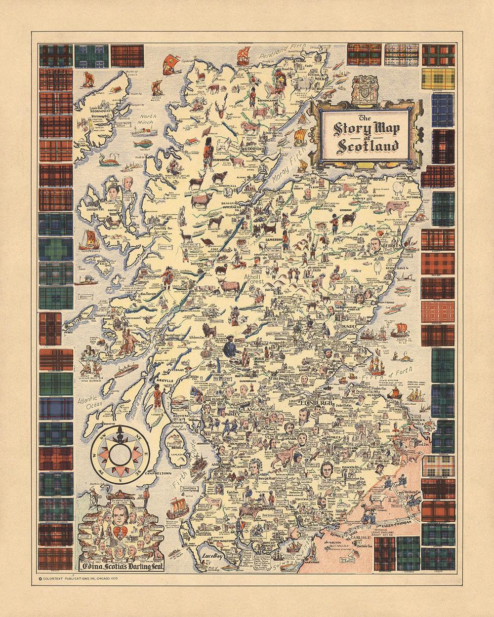 - Pictorial and thematic: The map is richly illustrated with vignettes and tartans, making it both informative and visually appealing.