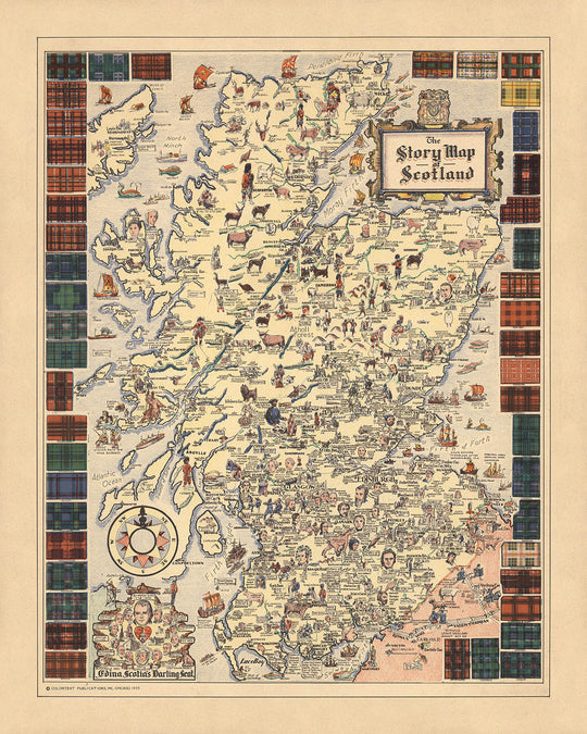 The "Story Map of Scotland," crafted by Colortext Publications in 1935, is a captivating blend of artistry and historical narrative. This pictorial map is a treasure trove of Scottish heritage, capturing the essence of the nation's storied past through vivid illustrations and detailed vignettes. Colortext Publications, renowned for their educational and illustrative maps, have meticulously designed this piece to offer both visual delight and historical insight. The map is adorned with portraits of significant historical figures, such as Flora MacDonald and Bonnie Prince Charlie, bringing to life the tales of Scotland's tumultuous history.