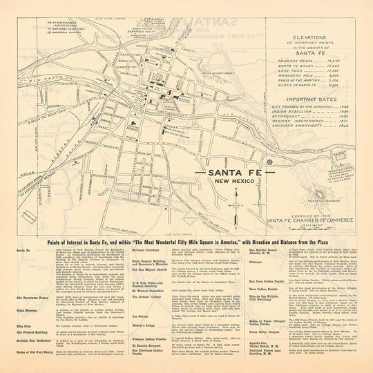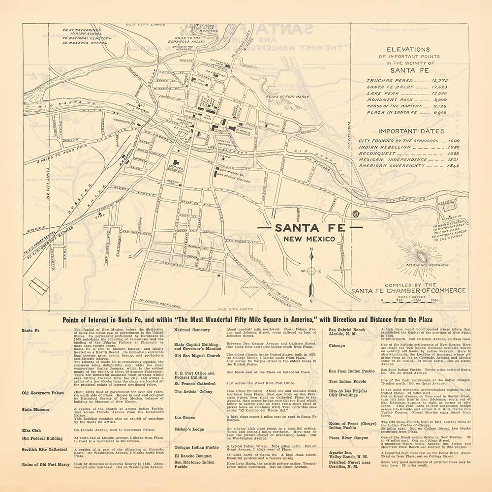The map also shows distances to other towns and landmarks outside of Santa Fe, some important dates (Santa Fe was originally founded in 1609 by the Spaniards, making it the oldest seat of government in the USA)... and more!