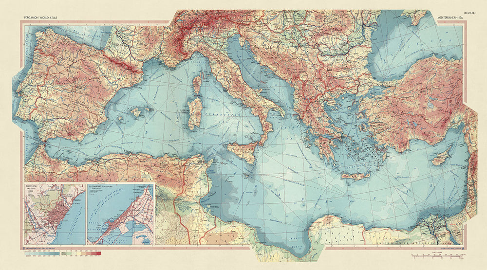 The map extends its reach from Tel Aviv and Cyprus in the east to Bern and Geneva in the north, and from Budapest and Bucharest in the northeast to the coastal regions of North Africa. It is a visual feast of geographical diversity, with each region depicted in meticulous detail. The insets of Barcelona and El Iskandariya (Alexandria) offer an intimate look at these cities, highlighting their importance in the Mediterranean region.