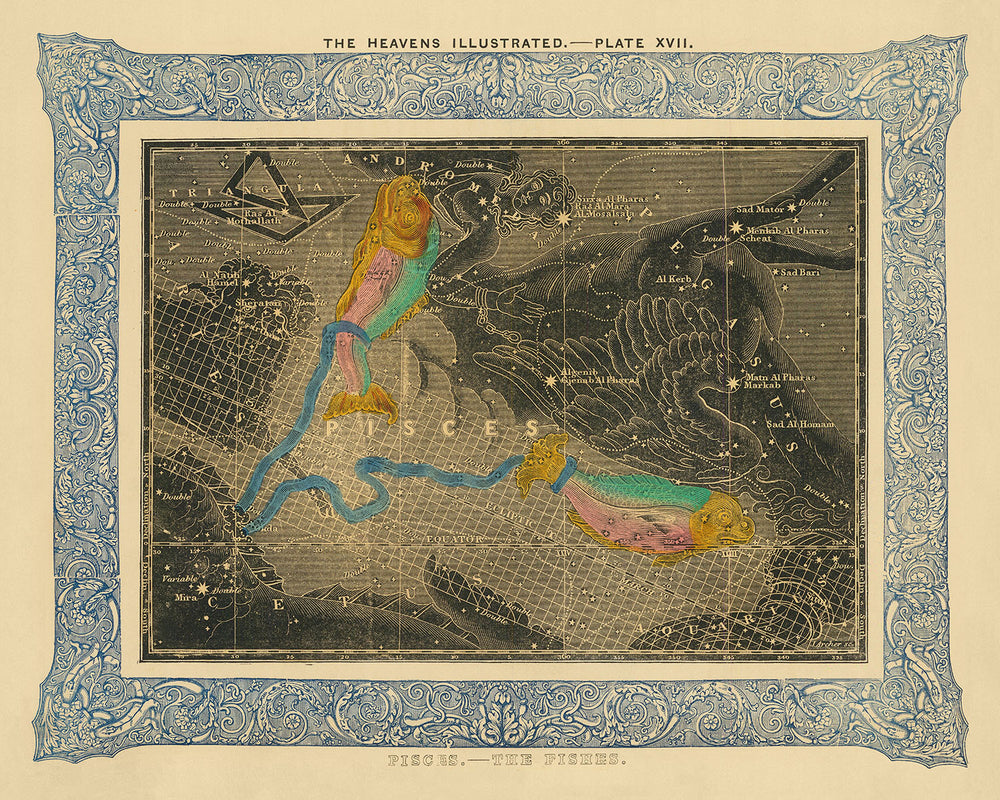 Duncan Bradford was a notable figure in the 19th century, contributing significantly to the field of astronomy with his detailed star charts. This artwork, in particular, is a testament to his skill and dedication, as it beautifully illustrates the constellation Pisces with vibrant colours and precise celestial details that are both scientifically accurate and artistically enchanting.