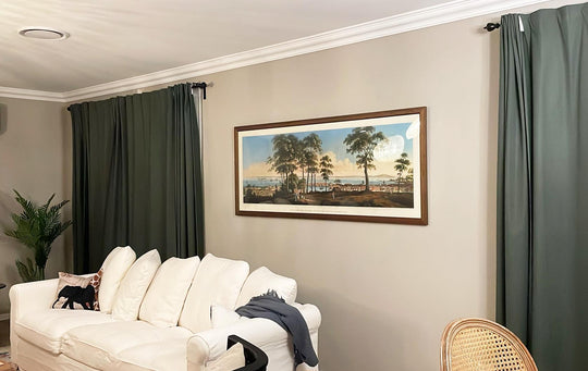 Most maps, art and illustrations are also available as a framed canvas. We use matte (not shiny) cotton canvas, stretch it over a sustainably sourced box wood frame, and then 'float' the piece within a wood frame. The end result is quite beautiful, and there's no glazing to get in the way.