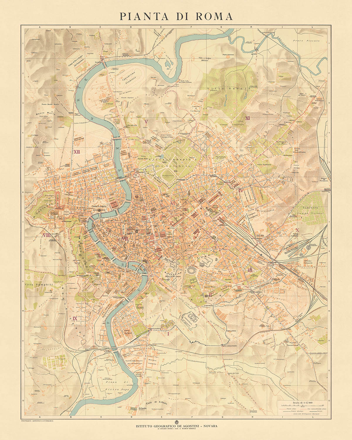 Produced by Istituto Geografico De Agostini during its founding year, the "Pianta di Roma" not only stands as a valuable historical document but also as a testament to the enduring legacy of Italian cartography. The map’s creation at a pivotal time in both the mapmaker's history and that of the city it represents makes it an invaluable resource for historians, cartographers, and anyone fascinated by the evolution of urban landscapes. Owning this map is akin to possessing a piece of Rome’s storied past, presented through the lens of one of Italy’s most esteemed geographical institutions.