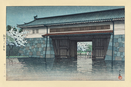 Immerse yourself in the tranquil allure of "Spring Rain at Sakurada Gate, Tokyo" by the celebrated Japanese artist Hasui Kawase. Originally created in 1935 and titled in Japanese as "Sakuradamon no Harusame" (桜田門の春雨), this iconic woodblock print invites the viewer into the quiet poetry of a rainy spring day in Tokyo. Kawase, widely regarded as a master of the shin-hanga (“new prints”) movement, is renowned for his evocative landscapes, which beautifully marry traditional ukiyo-e techniques with Impressionist influences to capture the mood and atmosphere of early twentieth-century Japan.