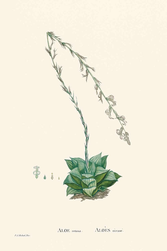 Star Cactus (Aloe Retusa), first published in 1802, is a stunning botanical illustration crafted by the esteemed Pierre-Joseph Redouté. Known as one of the greatest botanical illustrators, Redouté's enduring legacy comes alive in this exquisite depiction. This Belgian-born artist achieved early success as a painting tutor to Marie Antoinette and later became renowned for his prolific work at the behest of Josephine Bonaparte, Napoleon's wife. His career was marked by an extraordinary output, painting over 2,100 botanical illustrations featuring more than 1,800 species.