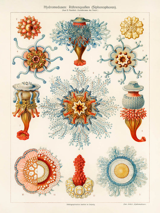 "Hydromedusen Rohrenquallen (Siphonophoren)" is an exquisite illustration from Ernst Haeckel's renowned work "Kunstformen der Natur" (Art Forms in Nature), first published in 1904. This artwork showcases a stunning array of jellyfish, meticulously detailed to capture the elegance and complexity of these ethereal marine creatures.
