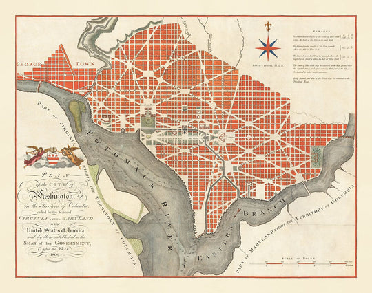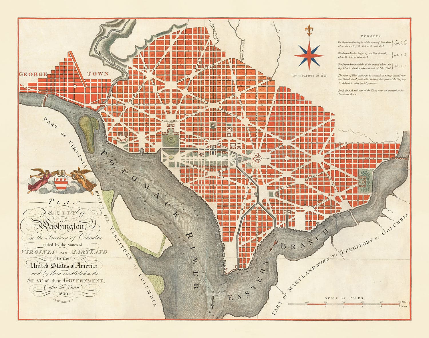 Very Old Map of Washington DC, 1795 by John Russell: Georgetown, White House, Capitol, White House, City Plan
