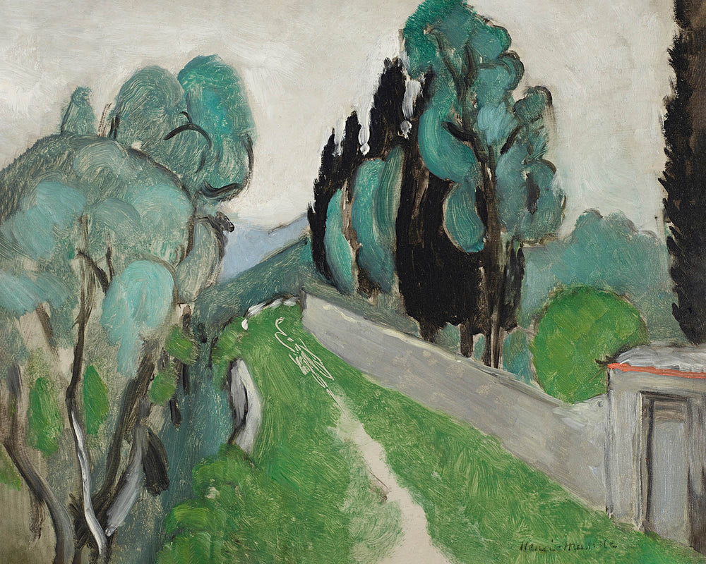 Henri Matisse stands indelibly as a key figure in modern art. His ability to harness complex emotions through simplicity of form and color marks this artwork as notable for those who appreciate art's emotive power. "Paysage avec cyprès et oliviers aux environs de Nice" transports you to Nice with its meditative depiction of cypresses and olive trees, rooted in the verdant landscape of Southern France.