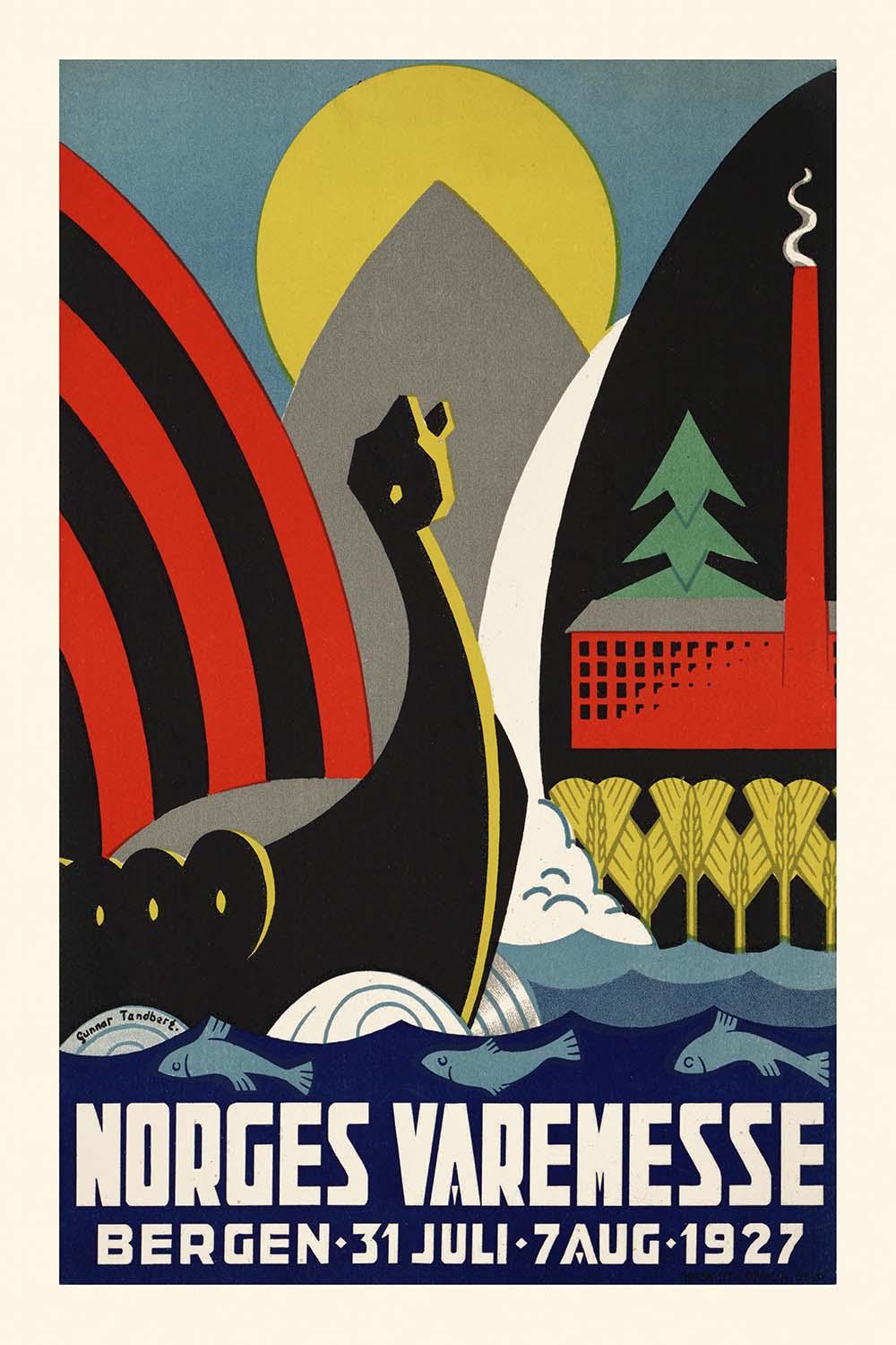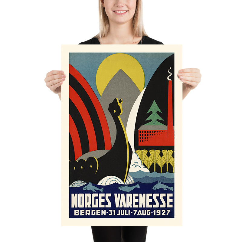 Norges varemesse, Bergen, 31. juli – 7. aug. 1927 by Gunnar Tandberg is a striking Art Deco travel poster created for the Norwegian Trade Fair in Bergen at the height of the interwar boom. With its dynamic Viking ship cutting across stylized waves, crisp factory silhouettes, and orderly stands of trees, the design celebrates Norway’s maritime past and its modern industrial future—all distilled into a bold, optimistic vision typical of the late 1920s.