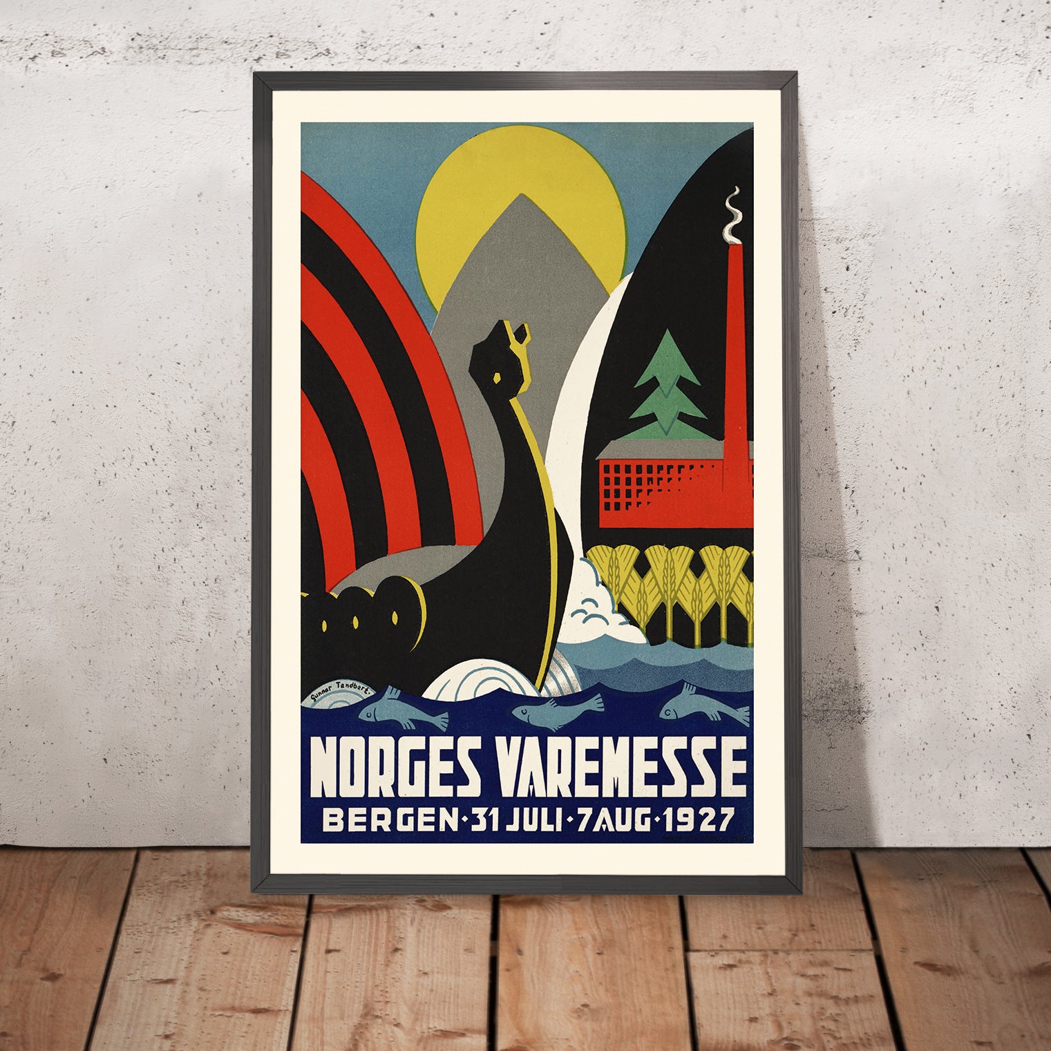 Why this subject matters: Bergen—gateway to the fjords and one of Norway’s great port cities—served as a fitting stage for the national trade fair in 1927. The event symbolized a nation confidently engaging with innovation and industry while honoring a deep maritime heritage. Tandberg’s composition brings these themes into dialogue: the longship as timeless emblem of seafaring prowess; the factory block and plume as shorthand for progress; verdant tree forms hinting at natural abundance—together a clear, modern advertisement for a forward-looking Norway.