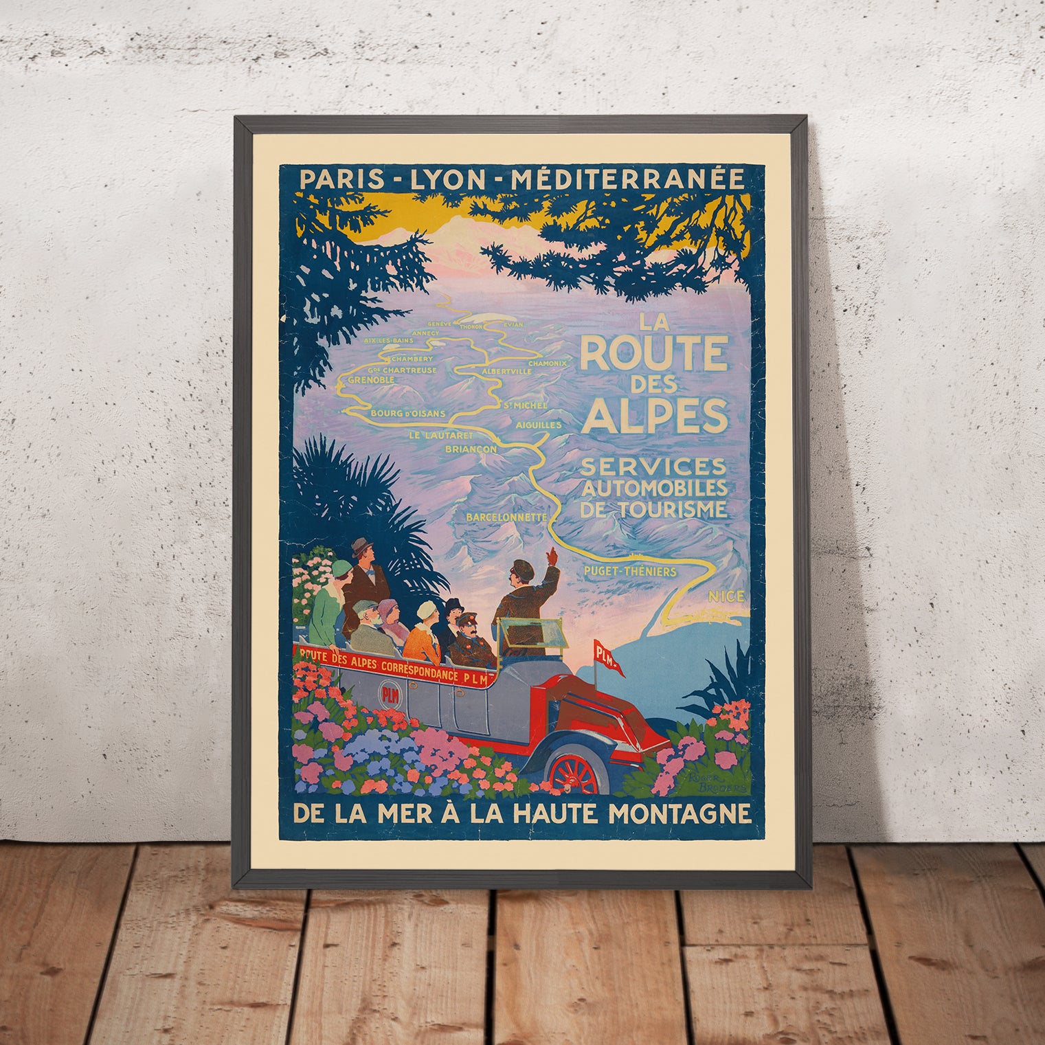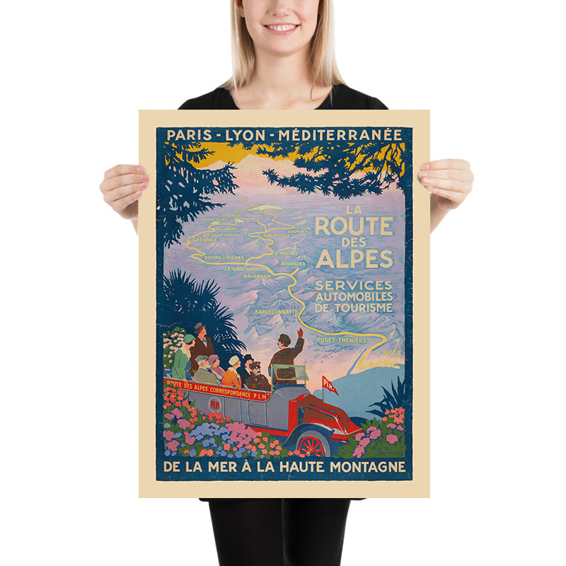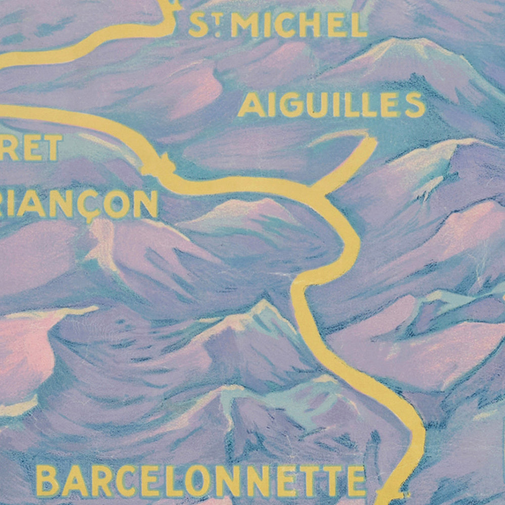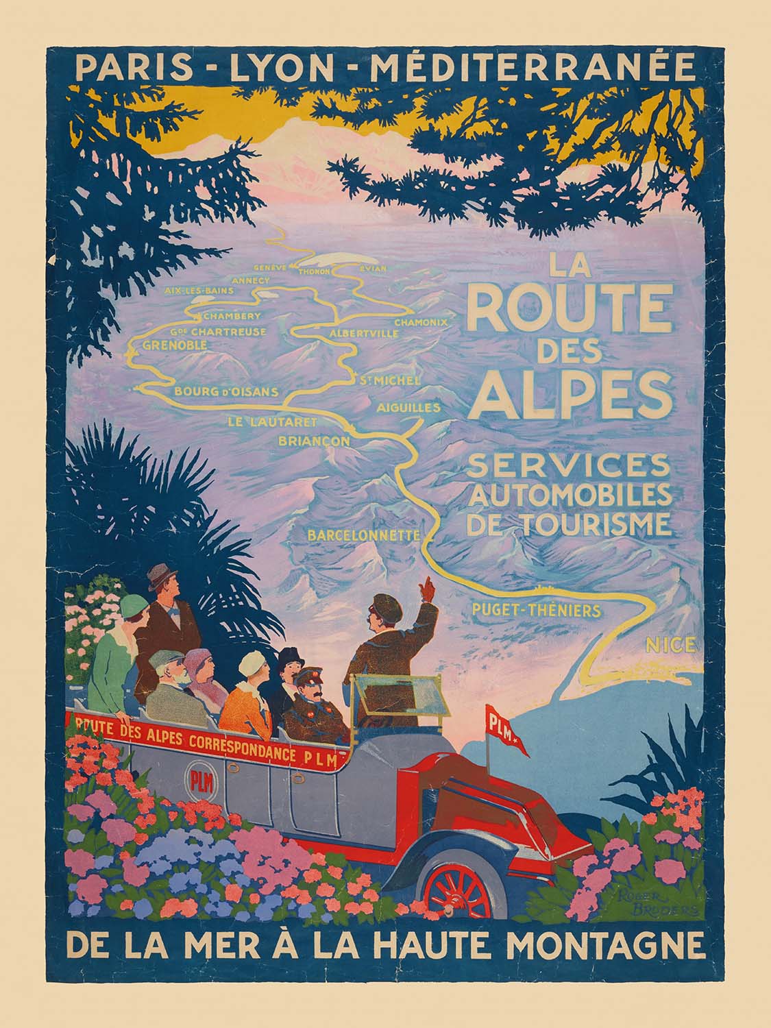 About the subject: “La Route des Alpes” celebrates the scenic artery that threads from the lakes of the north to the Mediterranean, crossing dramatic passes and storybook valleys along the way. In the years after World War I, this route symbolized freedom, modernity, and leisure—an irresistible call to motorists and holidaymakers to explore mountain resorts, glaciers, and winding corniches, then descend to the warmth of the coast.