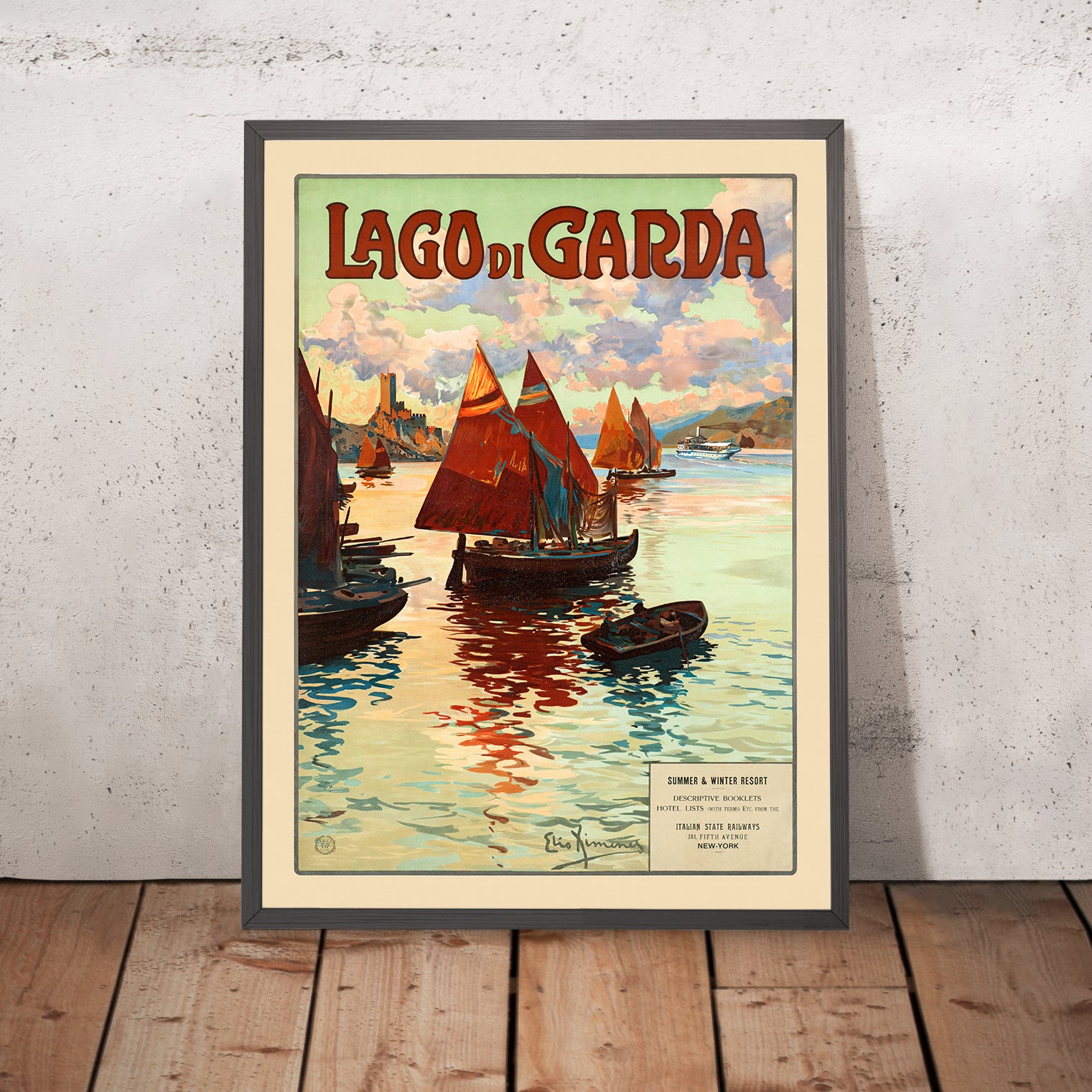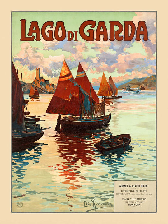 Lago di Garda by Elio Ximenes captures Italy’s largest lake at its most luminous—triangular crimson sails gliding across a blue-green expanse beneath soft, curling clouds. Created in the golden age of European leisure travel, this antique travel poster channels the romance of the Belle Époque, inviting the viewer to remember sunlit crossings between storybook towns like Sirmione, Riva del Garda, and Malcesine. Even without a documented year of issue, its Art Nouveau sensibility places it firmly in the era when elegant posters were the most persuasive ambassadors of place.
