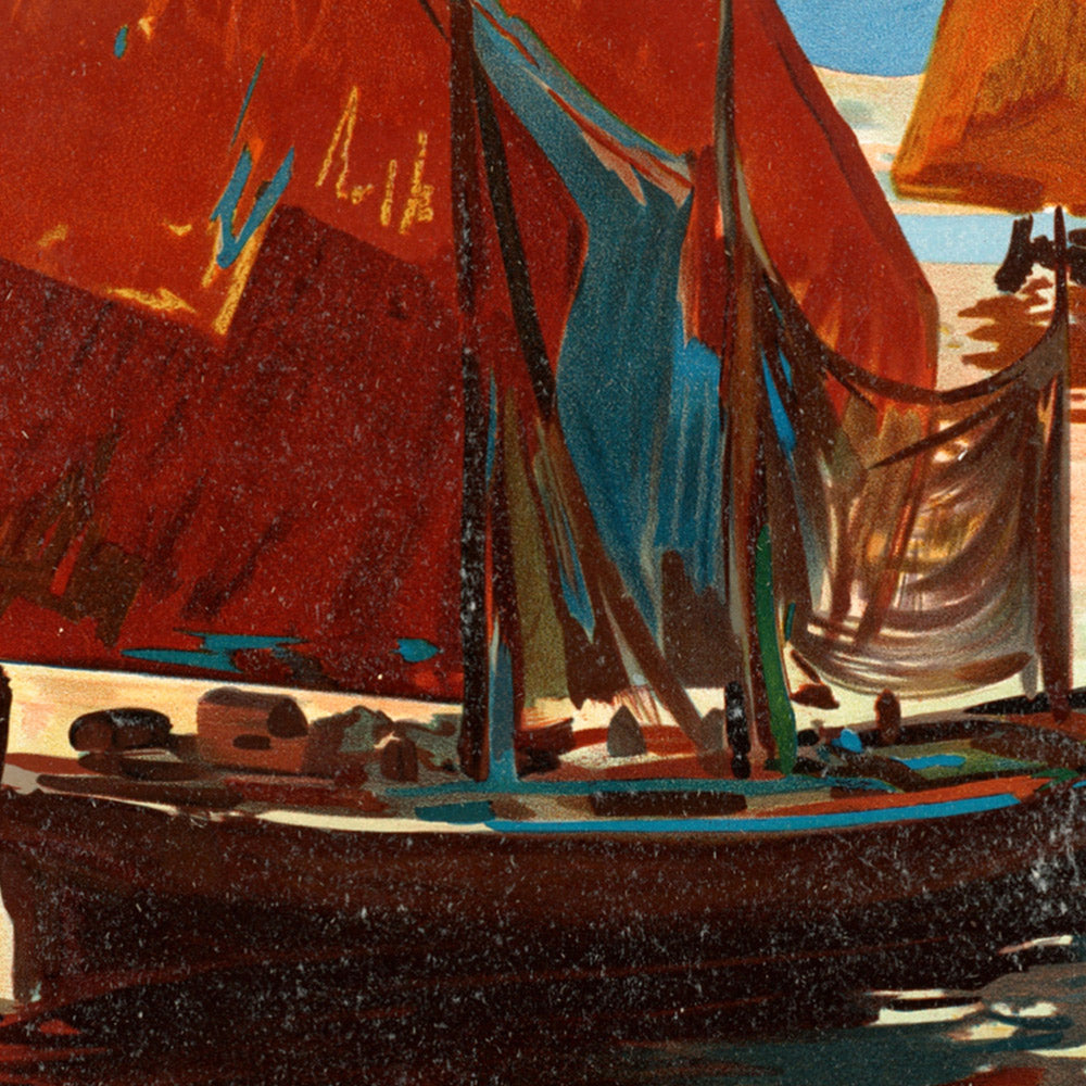 The design rewards close looking: the saturated red of the sails cuts boldly against bands of cobalt and jade, while soft, swirling cloud forms echo in the water’s surface. Ximenes balances geometry and grace—the sharp triangles of sail against rounded hulls and undulating shoreline—to create a dynamic yet tranquil scene. The shimmering reflections function almost like brushstrokes lifted from Impressionism, but the overall structure and typography remain decisively Art Nouveau. It’s a piece that adds warmth and a dash of adventure to interiors—from coastal living rooms to modern minimal spaces.