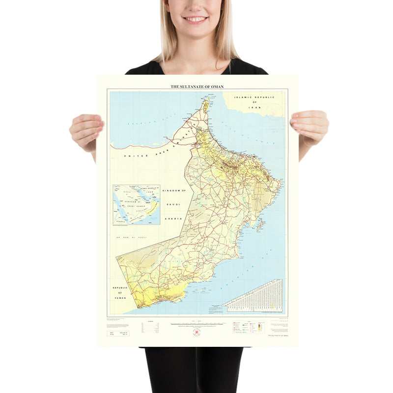 Borders and seas give the map its geopolitical bearing. International boundaries are crisply stated against the United Arab Emirates, Saudi Arabia, and Yemen, while the northern peninsula of Musandam—home to Khasab—faces the Strait of Hormuz and the maritime approaches to Iran. Coastal annotation tracks islands and promontories from the Daymaniyat offshore Shoals and Masirah Island down to the Hallaniyat archipelago, each feature distinctly claimed within Omani territorial waters. This assertive littoral framing, allied to precise landward delimitation, captures the early‑1990s settlement of borders and the state’s maritime self‑definition. In sum, the map locates Oman not merely in space, but in a moment of strategic clarity—rooted, navigable, and unmistakably sovereign.
