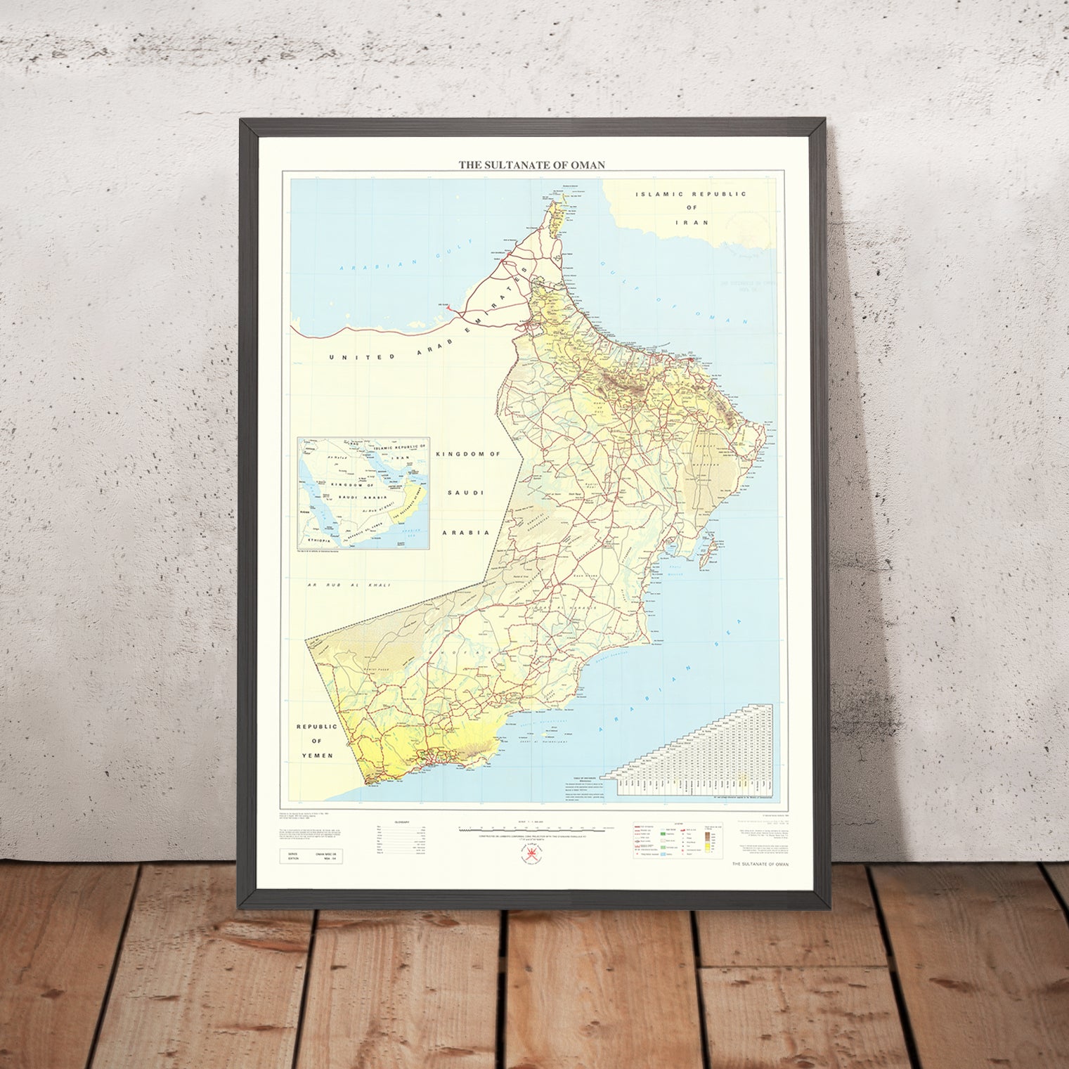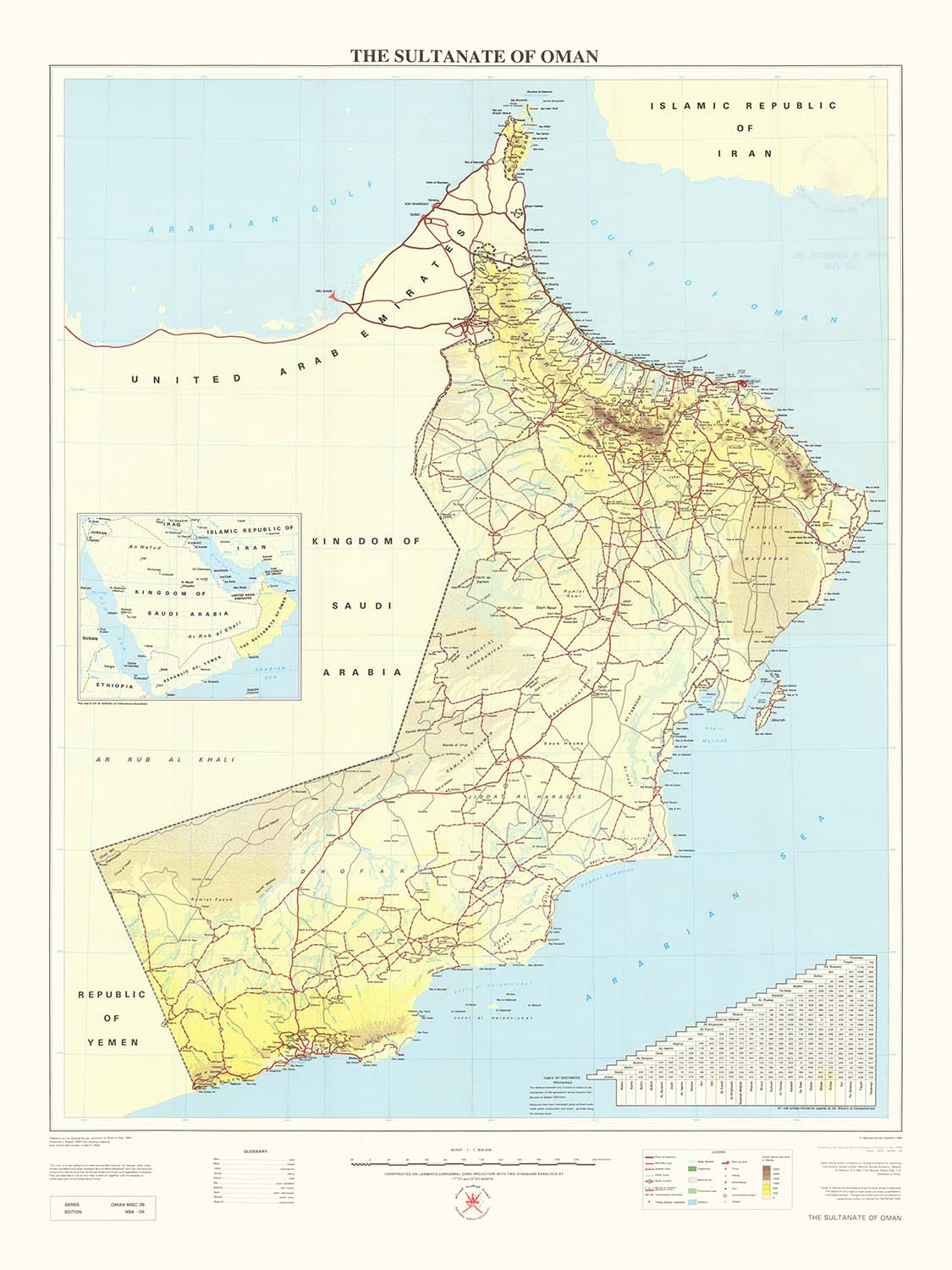 The Sultanate of Oman is the original title of this richly detailed national map, issued by the National Survey Authority of Oman in May 1994. Composed at a pivotal moment in the country’s modern development, it unites physical topography with civic infrastructure in a clean, authoritative hand: dual carriageways and metalled roads braided with graded tracks, airports and bridges, forts and towns, all set against the measured rise of mountains and the sweep of desert. A lucid legend anchors a methodical layout that balances political boundaries with natural landforms, while the cartography underscores the inalienability of islands and coastal features within Omani territorial waters. The result is both a navigational instrument and a testament to territorial clarity in a complex regional theater.