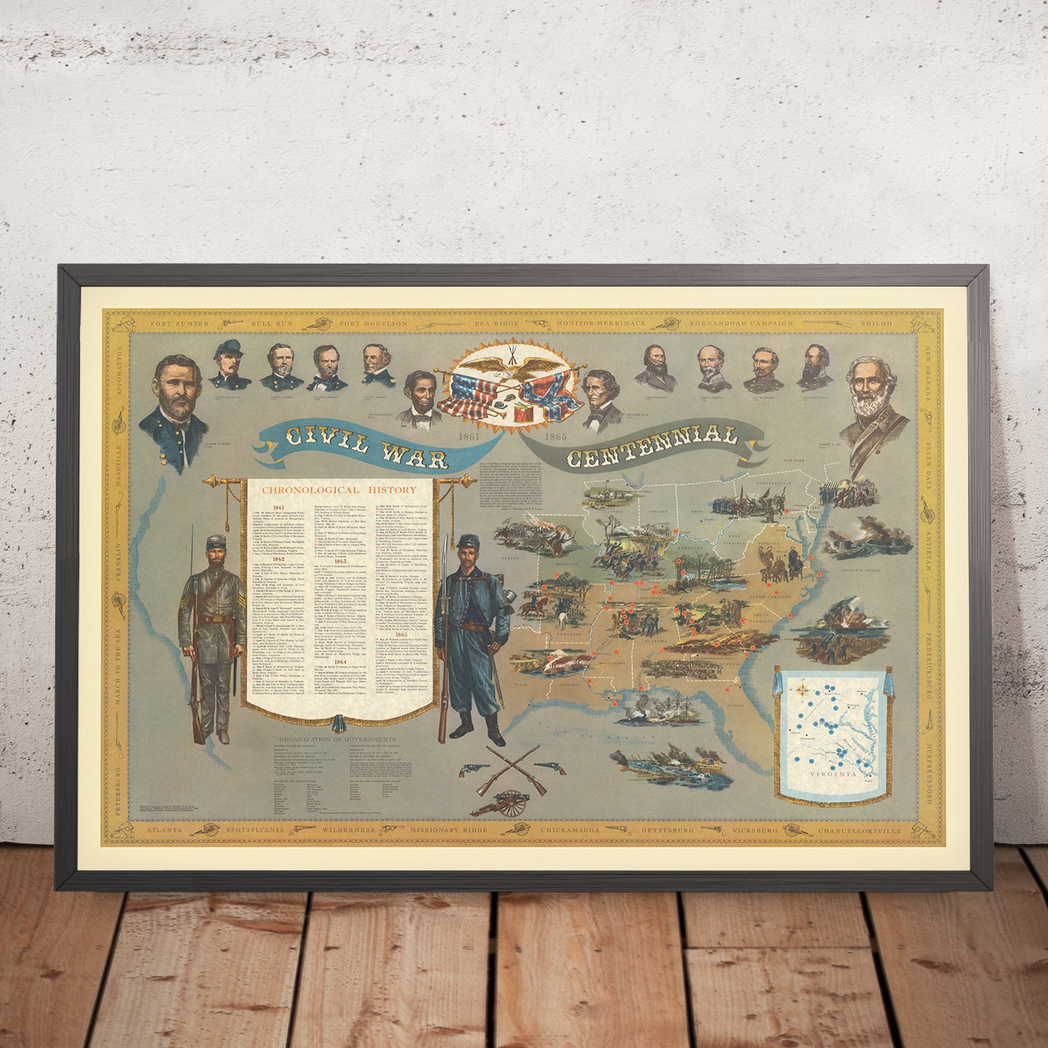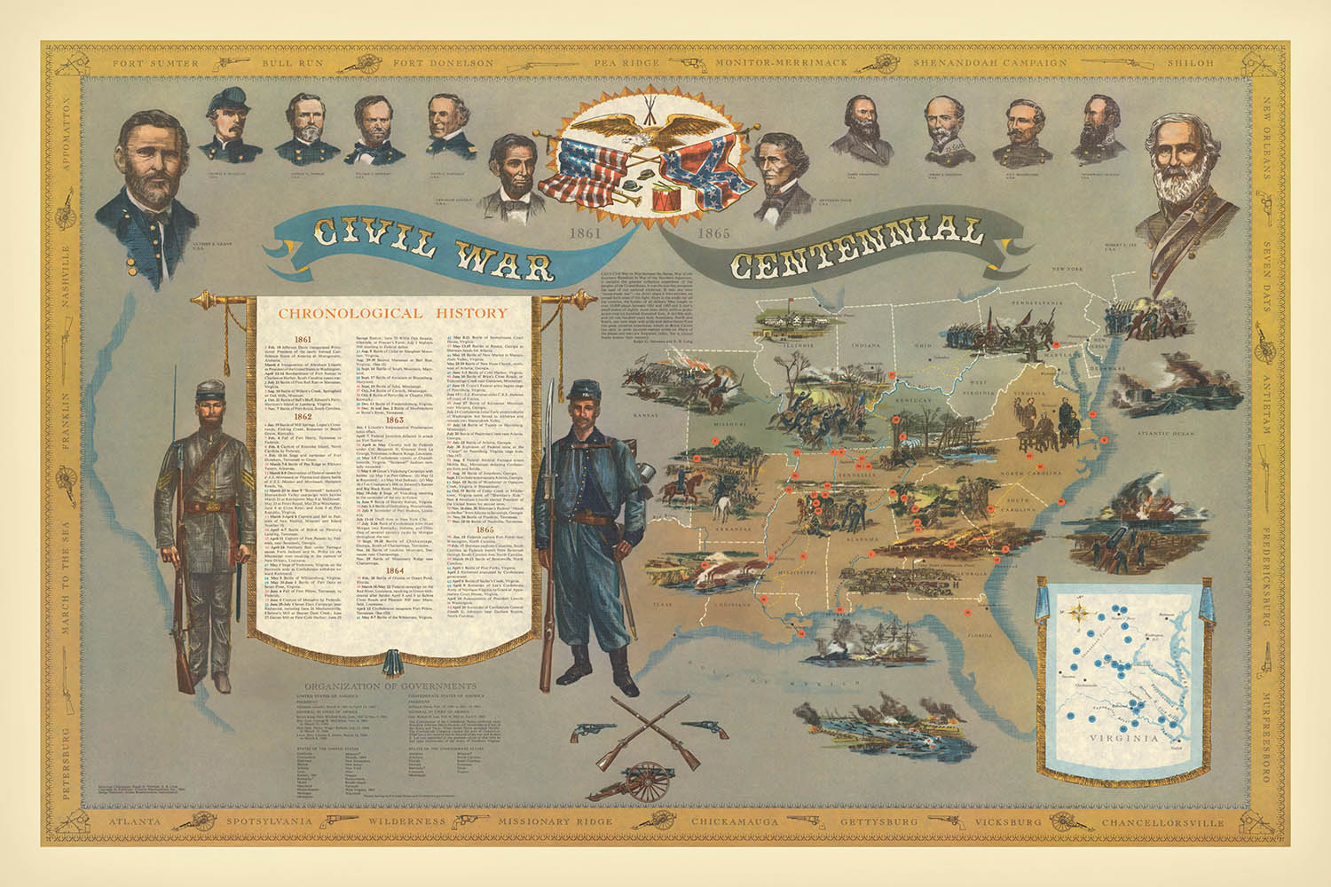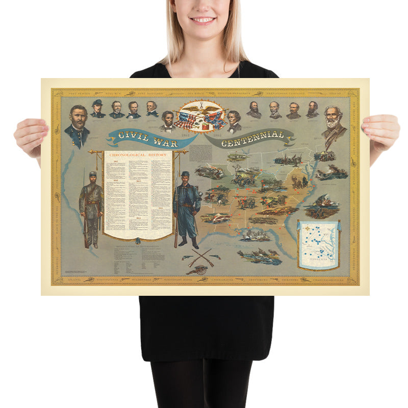 Created in 1960 by historian and bibliophile Ralph G. Newman, the 1861–1865 Civil War Centennial map is a richly detailed commemoration of America’s defining conflict. An ornate central cartouche sets a ceremonial tone, while ribbons and banners frame a densely informative field of pictorial vignettes. Across the United States—especially the Eastern and Southern theaters—illustrative markers pinpoint battlefields, naval engagements, and landmarks that shaped the course of the war. A chronological timeline marches along the margins, anchoring each image in time and helping viewers follow the cascade of events from 1861 to 1865. Portraits of prominent figures, paired with scenes of soldiers and equipment, weave biography, strategy, and memory into a single, cohesive visual narrative.