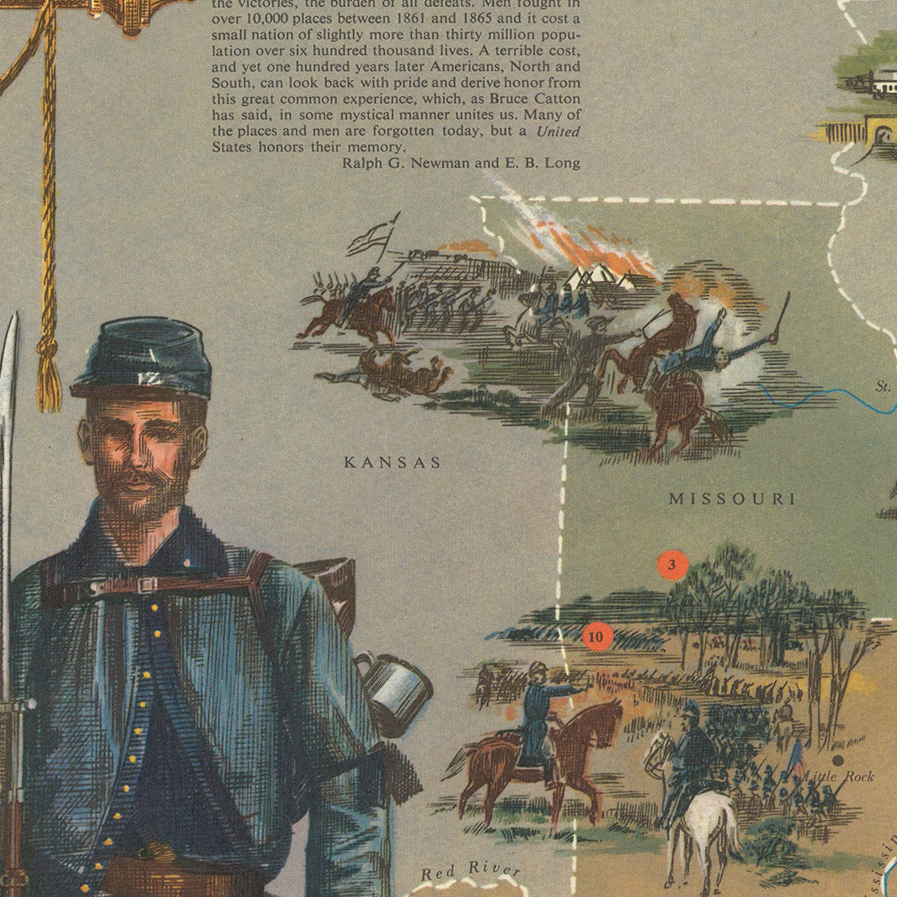 Old Pictorial Map of American Civil War 1861–65 by Newman, 1960: Ft. Sumter, Antietam, Gettysburg, Vicksburg, Richmond