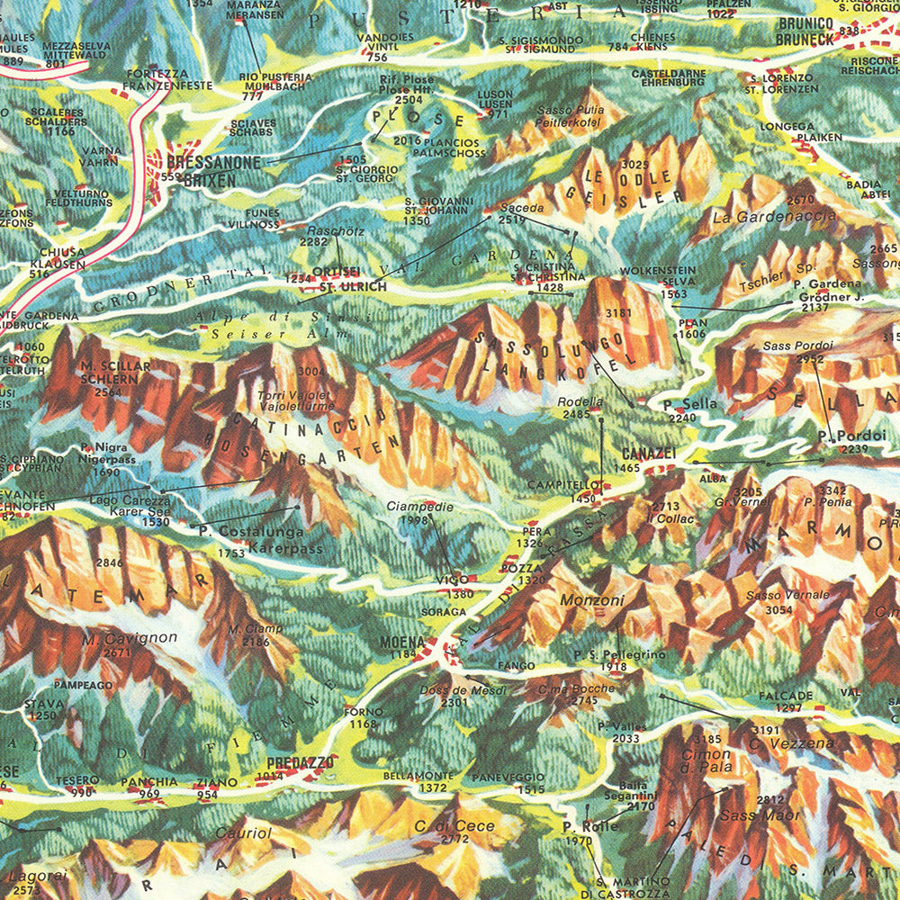 Historically, the map captures the Dolomites at a pivotal moment. The early 1970s saw Alpine tourism mature from elite alpinism into a broad culture of scenic motoring and family holidays, and this bilingual Italian–German presentation reflects the multilingual fabric of South Tyrol as autonomy arrangements renewed confidence in the region’s future. It charts the celebrated Great Dolomites Road, an early-twentieth-century feat that opened high passes like Pordoi to leisure travel, and it gestures to deeper layers: Cortina d’Ampezzo’s post-Olympic allure and the First World War’s lingering presence on the high fronts around the Tre Cime. As such, the sheet is both travel companion and cultural document, distilling natural drama and human history into a single vista.