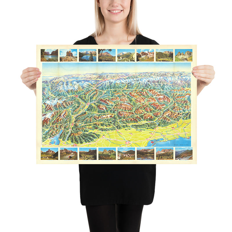 Old Pictorial Map of Tyrol Dolomites, 1973: Great Dolomites Rd, Cortina, Bolzano, Merano, Tre Cime